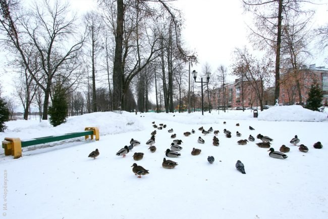 снег, зима, утки, птицы, голуби, парк, лавочка, скамейка