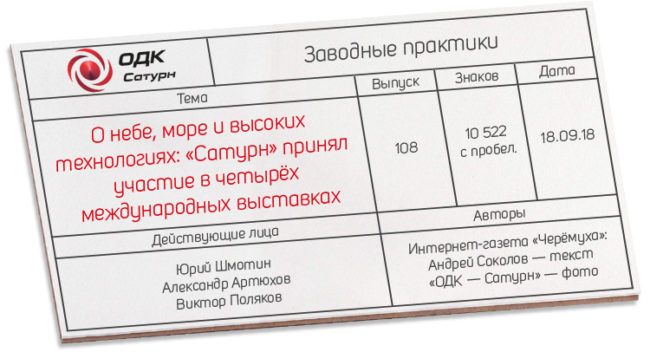 Лето и начало осени — традиционно сезон крупных промышленных выставок. Участие в них — необходимость для передового предприятия, при этом неважно, идёт речь о малом бизнесе или о крупном государственном холдинге. Выставки — это возможность познакомиться, представить свою продукцию, увидеть достижения коллег и конкурентов, определить векторы для развития и заключить соглашения. Рыбинское «ОДК — Сатурн» (входит в Объединённую двигателестроительную корпорацию госкорпорации «Ростех») с июля по сентябрь участвовало сразу в четырёх разноплановых выставках: «Иннопром-2018» в Екатеринбурге, «Армия-2018» в подмосковной Кубинке, «Гидроавиасалон» в Геленджике и «Импортозамещение-2018» в московском «Крокус Экспо». Продукция рыбинских моторостроителей, представленная на общих стендах ОДК, не осталась без внимания первых лиц государства.