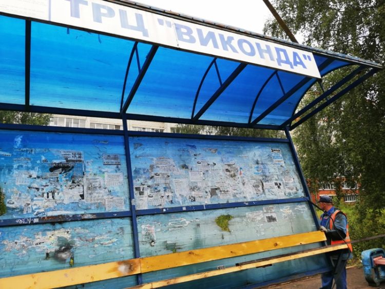 Судя по фото, присланным мэрией в качестве приложения к пресс-релизу, состояние установленного сегодня павильона не лучшее. Часть задней стенки сломана, со всех сторон остановка обклеена старыми объявлениями. Ранее конструкция находилась возле ТРЦ «Виконда». Её демонтировали в связи с тем, что торговый центр по своей инициативе установил новую. Даже название остановки на павильоне на момент монтажа осталось прежним.