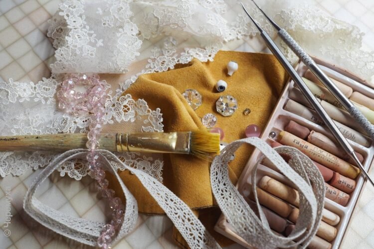 Когда приходишь в дом к мастеру, невольно ловишь себя на мысли, что открыл дверь в другой мир. Всюду коробки, шкатулки, корзинки с настоящими сокровищами — с кусочками тканей, причудливыми кружевами, тесьмой, бусинами, миниатюрными пуговицами. Рядом краски и материал для лепки. Блестящие стальные инструменты — как в медицинском кабинете. Тут же кисти — такому набору позавидовал бы и профессиональный художник: плоские и круглые, с коротким ворсом и с длинным, жёсткие и мягкие, собранные в тугой пучок и веерные. Стандартная квартира Ольги Рулёвой выглядит как настоящая мастерская, место, где воплощаются творческие фантазии и идеи.