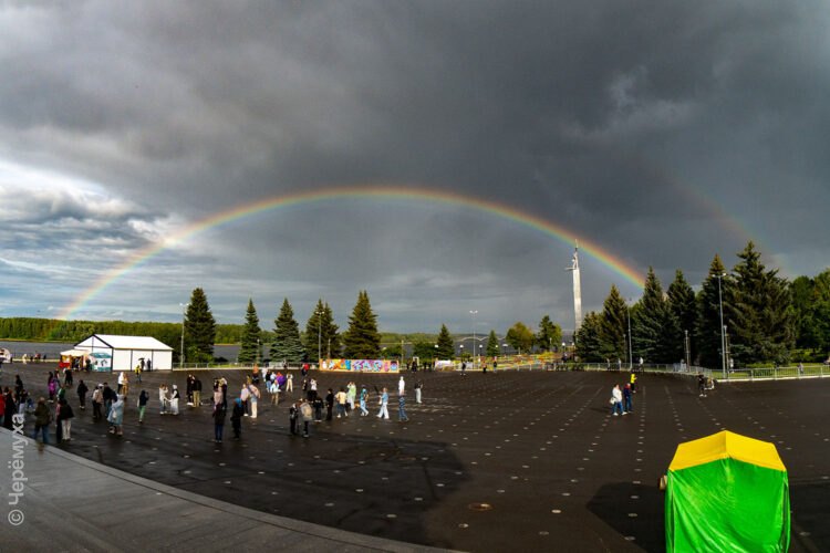 Ниже — фоторепортаж с праздника. Ведь лучше один раз увидеть, чем много раз услышать. Александр Колляков сумел поймать несколько ярких моментов праздника и запечатлел красочное природное явление над площадью — радугу.