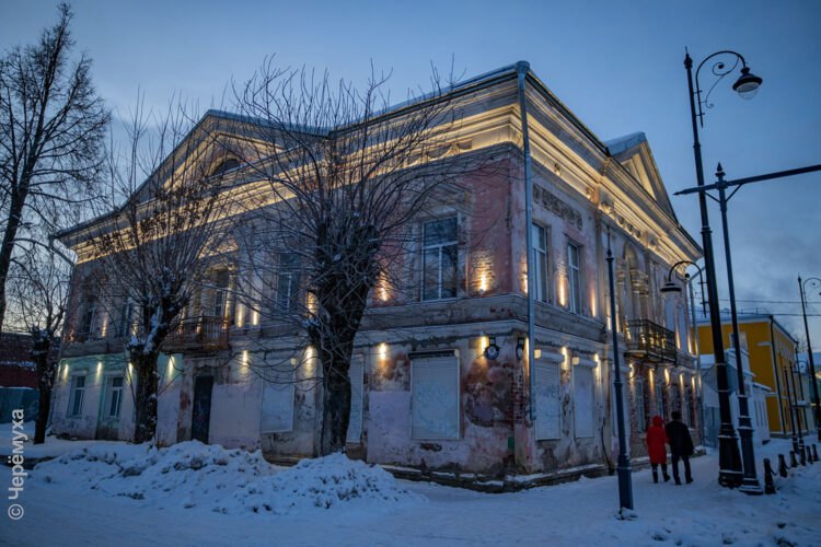 Так в тёмное время суток выглядит здание, которое находится на Чкалова, 15 / Гоголя, 16 в Рыбинске. Согласно списку объектов культурного наследия, опубликованному на сайте областной профильной госслужбы, это памятник регионального значения — Дом Григорьевых. Постройка датирована 1840 годом.
