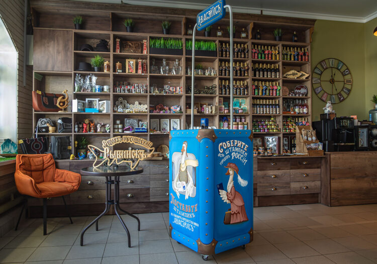 При разработке оформления стойки-чемодана и печати для Рыбинска учли местный визуальный код. К участию привлекли идейного вдохновителя музея старинных вывесок под открытым небом Митю Кузнецова и художницу Нину Матвееву.